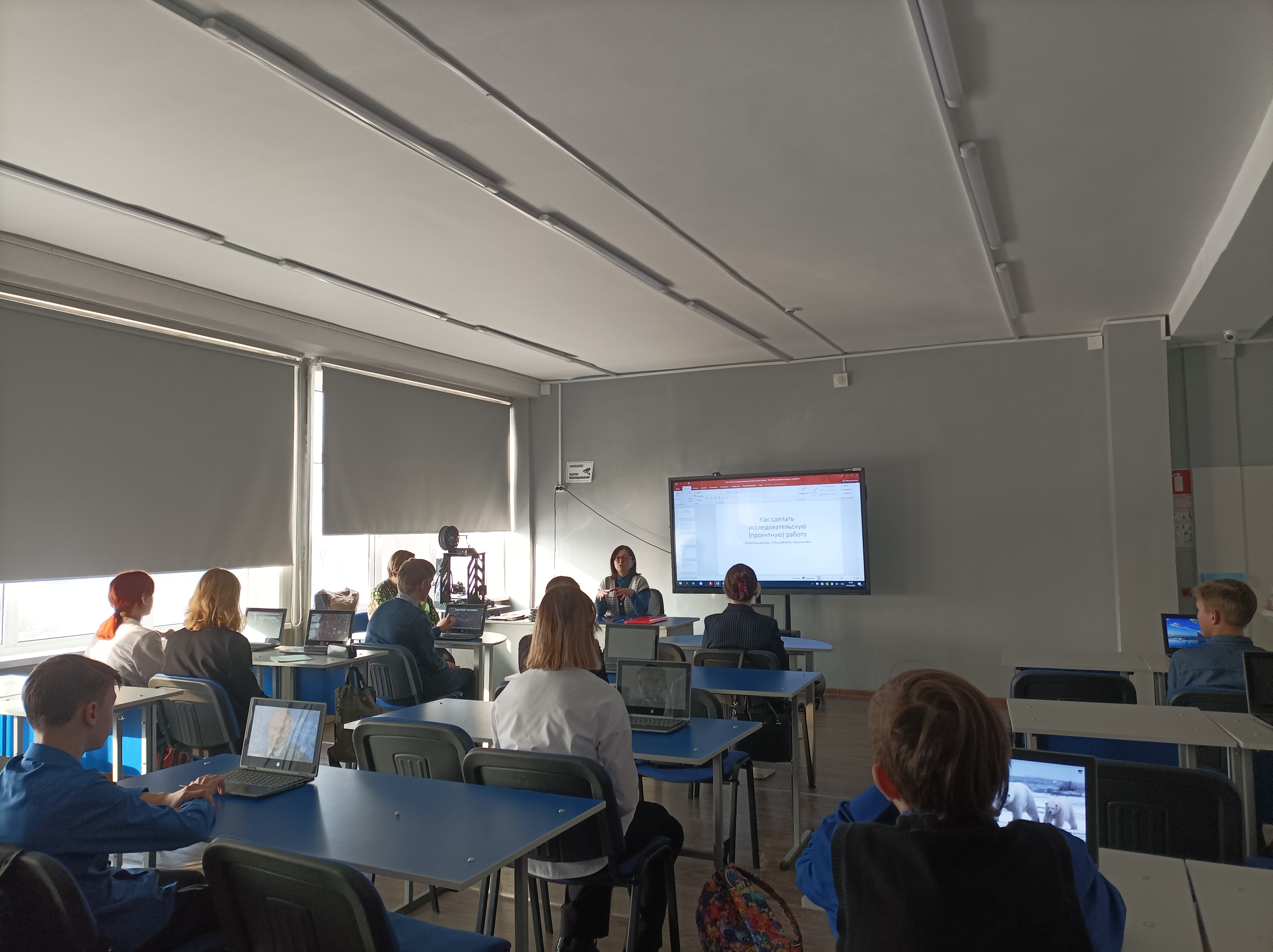 Занятие с кураторами из г. Красноярска, — Батаниной Еленой Владимировной и Злотниковой Олесей Владиславовной, во время которого учащимся 8-9 классов объяснили особенности оформления исследовательских проектов, поиска достоверных источников информации и провели практическое занятие по выбору темы, постановке целей и задач, формулировке гипотезы проекта.